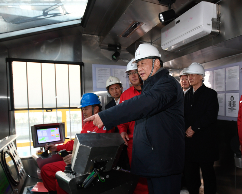 10月22日下午,中共中央總書記、國家主席、中央軍委主席習近平在山東省濟南市主持召開深入推動黃河流域生態保護和高質量發展座談會并發表重要講話。這是座談會前,習近平21日下午在位于東營市萊州灣的勝利油田萊113區塊考察時,登上二層鉆井平臺,察看鉆井自動化設備。新華社記者 李學仁 攝